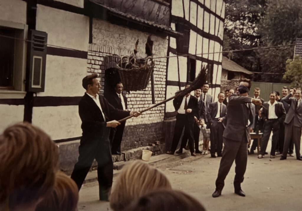 Zu Kirmessen, Erntedank- oder Oktoberfesten gibt es einen öffentlichen Wettbewerb, bei dem es gilt, mit verbundenen Augen einem vorher geschlachteten und kopfüber in einem Korb aufgehängten Hahn den Kopf abzuschlagen. Wem der entscheidende Schlag gelingt, wird damit für ein Jahr Hahnenkönig eines Dorfes, einer Hofschaft oder eines Vereins.