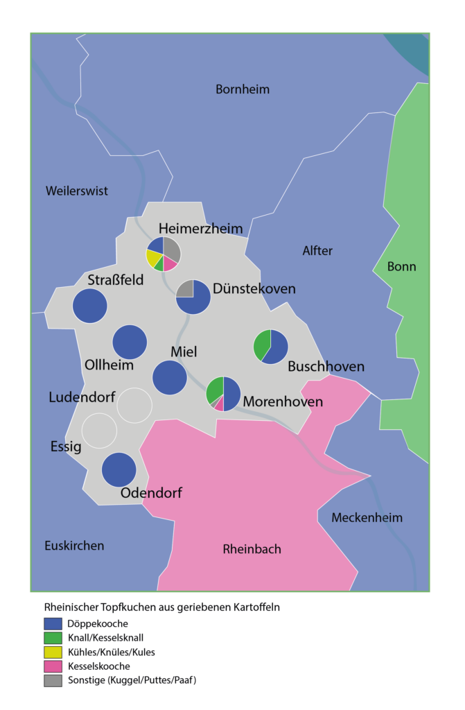 In die Kategorie Döppekooche fallen ebenfalls die Variationen Döppeche, Doppeko(o)che, Döppeköche,Döppe Kooche, Döppeskooche, Döppekuche, Döppschjeskooche, Düppekoche, Düppekuchen undTöpekuchen, wobei die Formen Döppekooche bzw. Döppekoche am häufigsten genannt werden. Die Antworten stammen aus der gesamten Gemeinde Swisttal, ihrer Nachbargemeinden Alfter, Bornheim, Euskirchen, Meckenheim, Rheinbach und Weilerswist, sowie aus den Gemeinden Bad Münstereifel, Bonn, Zülpich und über Rheinland-Pfalz. Der Begriff Döppekooche meint einen deftigen Kartoffelauflauf mit Fleisch, der typisch für das Gebiet des südlichen Rheinlandes ist (vgl. Dat Portal). Das Wort setzt sich aus den Bestandteilen Döppe und Kooche zusammen. Döppe geht auf Topf zurück, was einen kegel- oder keilförmigen Gegenstand meint. Im vorliegenden Dialektgebiet kann diese Gefäßbezeichnung mit dem Umlaut /ö/ geschrieben werden (vgl. DWb). Alternativ kommt in diesem Dialektgebiet die Form duppen für Topf vor (vgl. Pfeifer). Der zweite Bestandteil des Wortes, Kooche, bedeutet Kuchen. In diesem Fall besteht dieser Kuchenaus geriebenen Kartoffeln und kann in der Pfanne gebacken werden (vgl. RhWb).