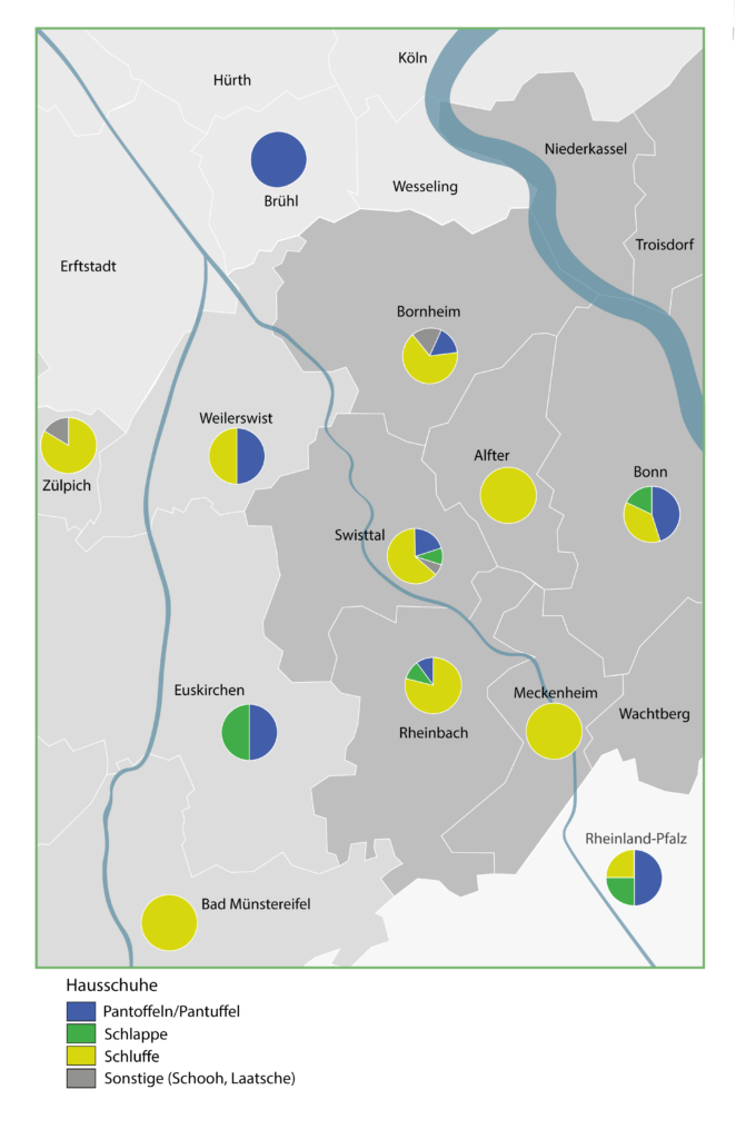 In den lexikalischen Datenerhebungen konnten 114 Nennungen ausgewertet werden, von denen 106 auf die drei Oberbegriffe Pantoffeln/Pantuffele, Schlappe und Schluffe entfallen.